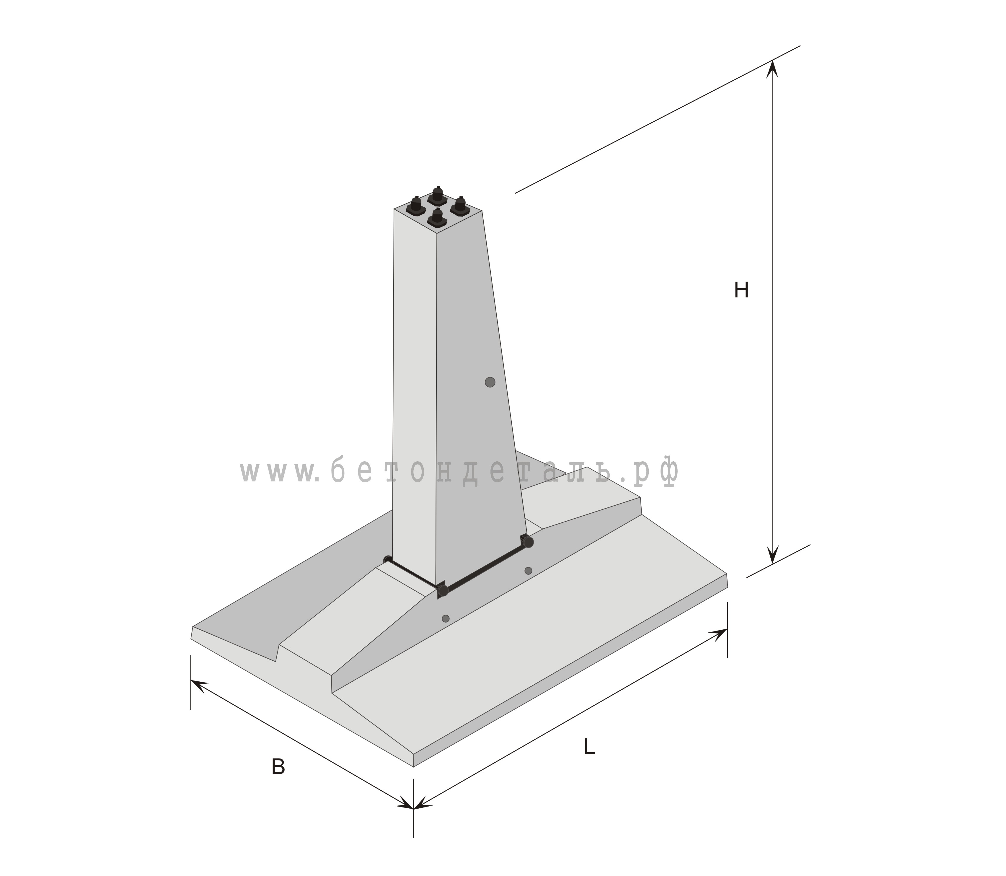 Фундаменты составные ФП 2.7-4.2-АV - это железобетонные подножники для анкерно-угловых опор ЛЭП, состоящие из отдельно изготовленных плит и стоек, которые соединяются между собой, непосредственно на месте строительства, при помощи двух горизонтальных шпонок. Изделия ФП 2.7-4.2-АV имеют в оголовке 4 болта диаметром М42 и базу 250 мм. Данные подножники предназначены для закрепления стальных опор воздушных линий электропередач с напряжением 500 кВ. Фундамент закладывают на глубину 5 м.
