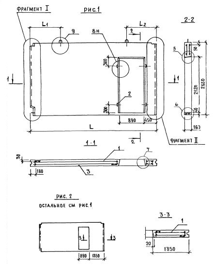 1,2,1,2 - индексы, характеризующие положение панелей в плане здания и их конструктивные особенности ( 1-панели поперечных стен или панели продольных стен, примыкающих к торцу здания; 2 - панель с проемом, 1 - ширина проема 890 мм; 2 - ширина меньшего простенка 450 мм).